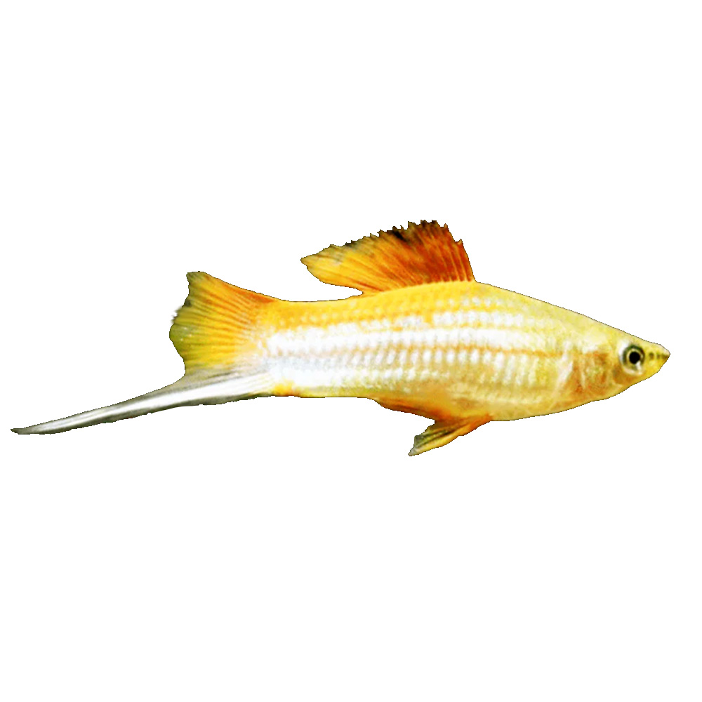 Golden Swordtail is a bright, golden-orange fish with a shimmering, almost metallic finish, adding a touch of vibrancy to any aquarium.