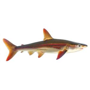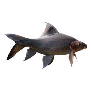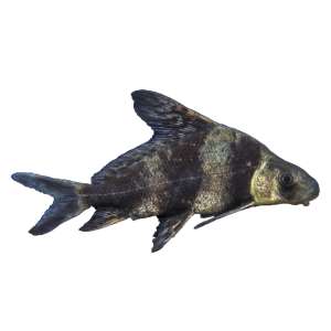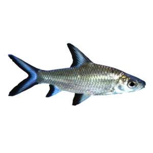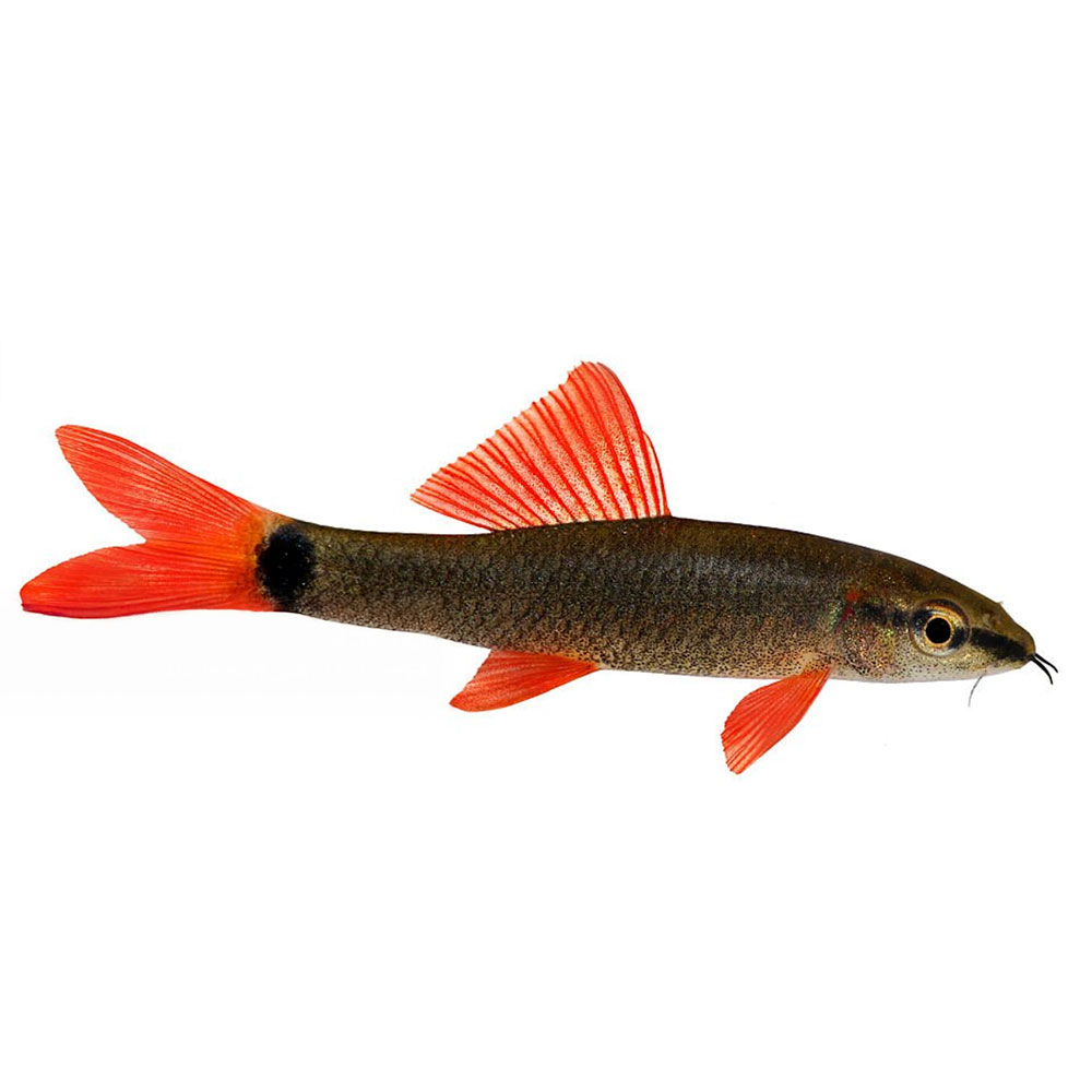 The Red Tail Black Shark is a striking freshwater fish with a sleek black body and a bright red tail, making it a favorite for aquarium enthusiasts.