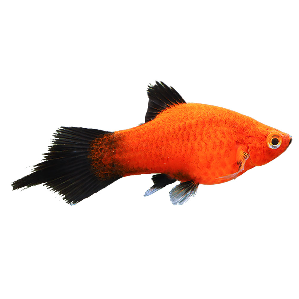 The Wagtail Platy is a charming freshwater fish known for its bright red, orange, or yellow body paired with distinctive black fins and tail, creating a beautiful contrast.